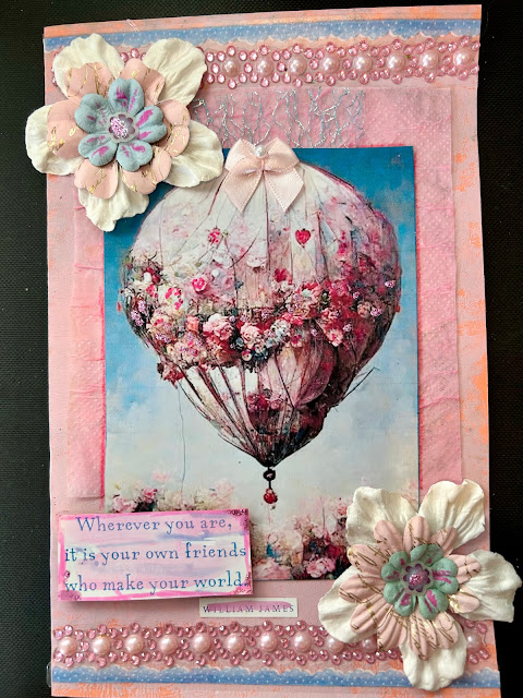 For the Greeting cards, there are two different color palettes : Both started with a gelli printed greeting cards. The hot air balloon images were the focal point. I layered textured papers, paper flowers, rhinestones, Stickles glitter, butterfly stickers, lace and ribbons. The sentiments came last and said "Because Happiness Happens when you choose it" and "Where ever you are it is your own friends that make the world"